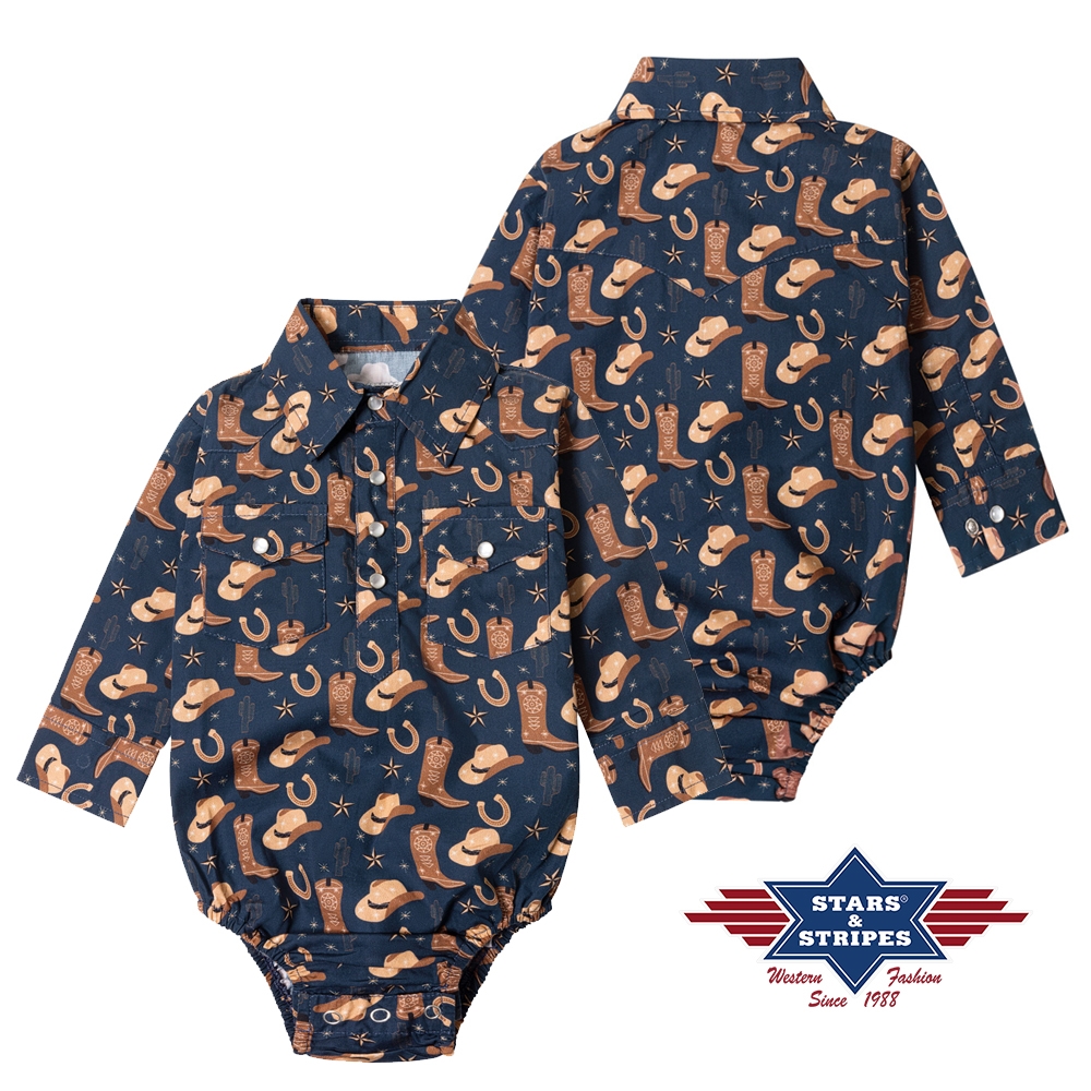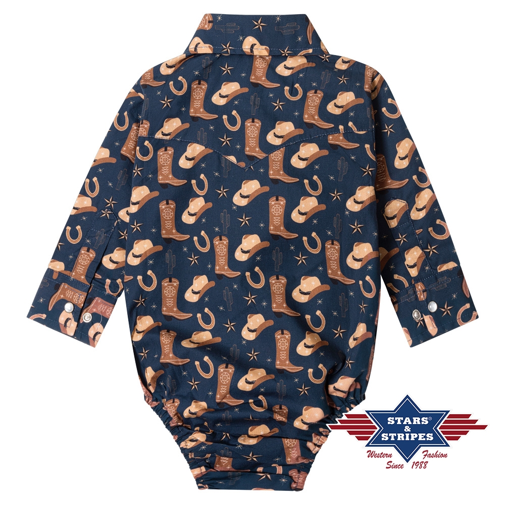 Langærmet baby‑body med sjovt cowboymotivSkjorte‑look med krave og brystlommer samt trykknapper i skridtetfor hurtige skift. Perfekt til små cowboys og som gave.