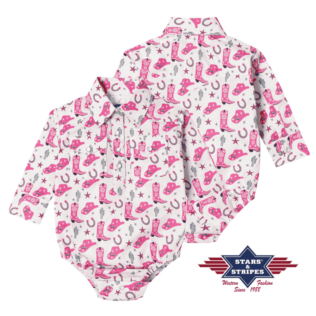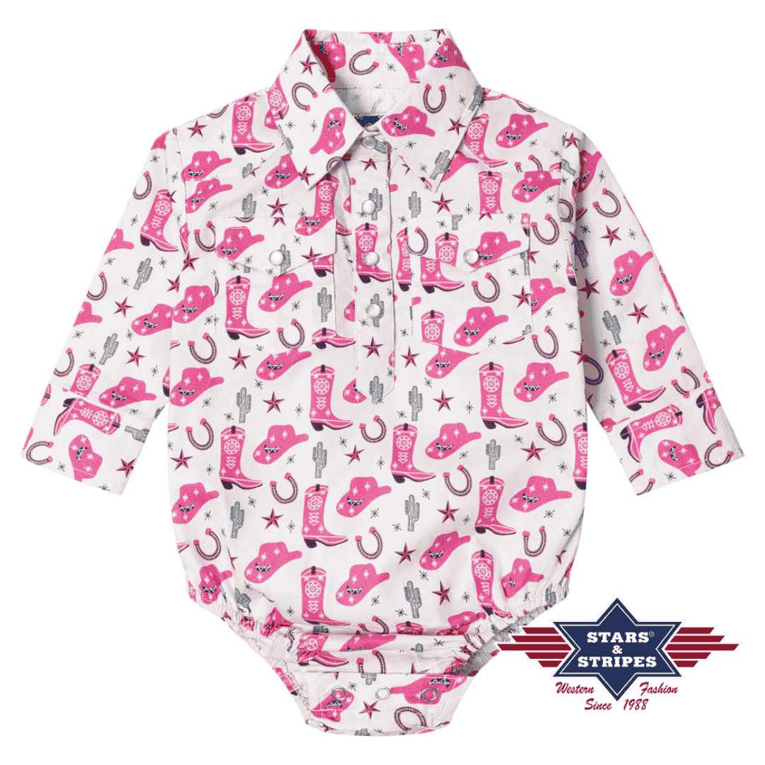 Sød babybodystock med lange ærmer, cowgirl-print og skjortelook med krave/lommer. Trykknapper i bunden. 100% bomuld.