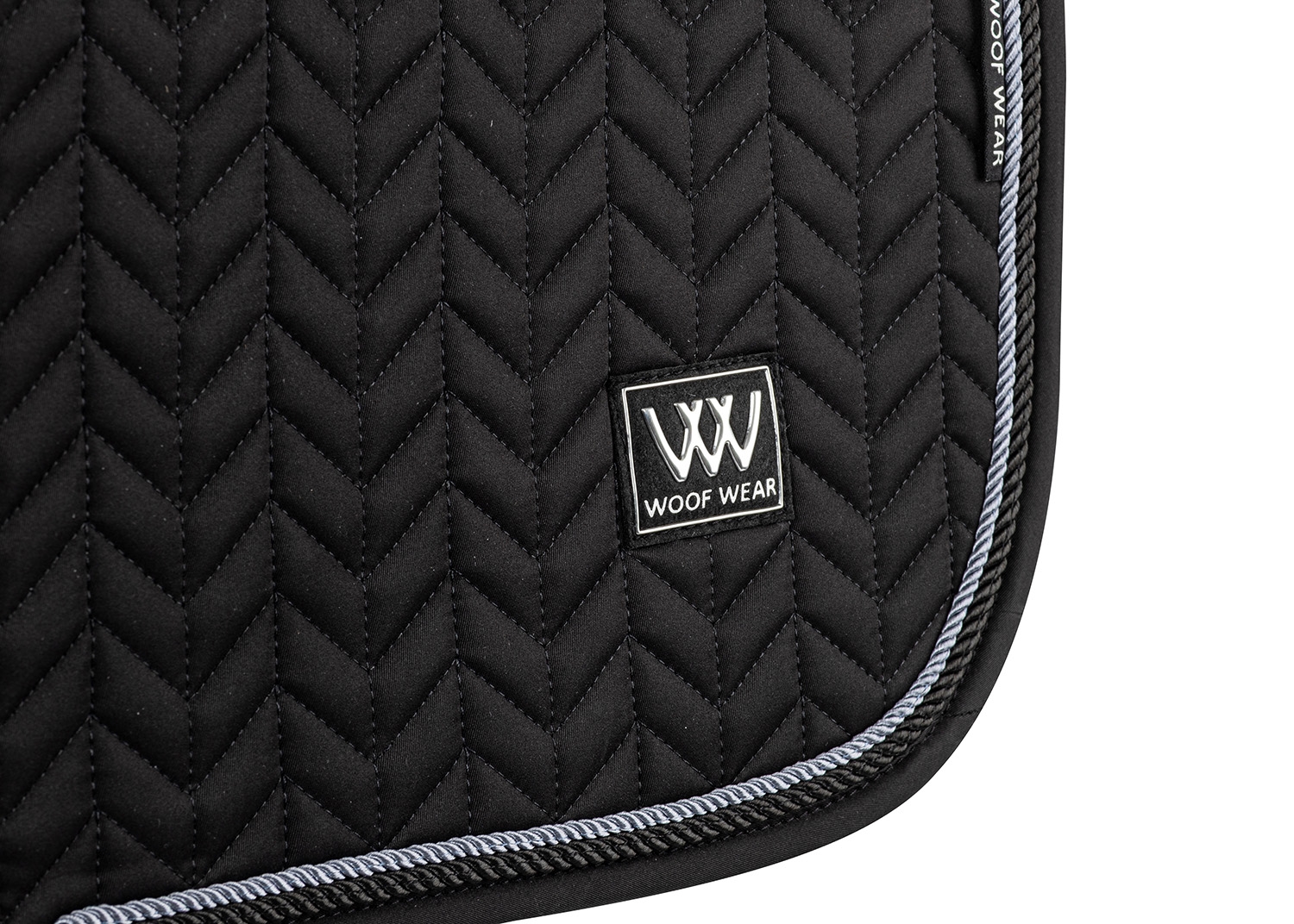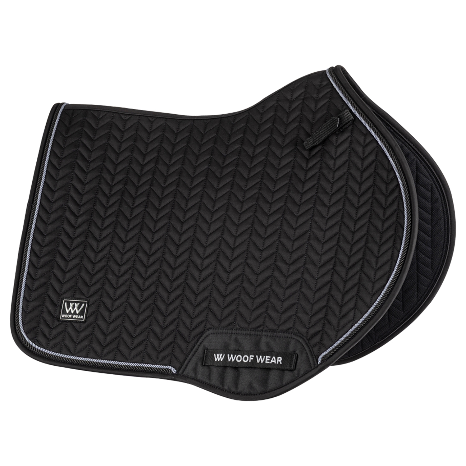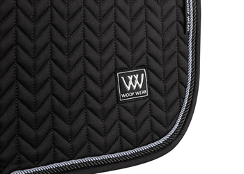 Herringbone springunderlaget er formskåret, så det følger både hestens linjer og moderne sadler, har en forhøjet mankeskæring for øget komfort og afsluttes med en sølvfarvet binding og Woof Wear-logo.