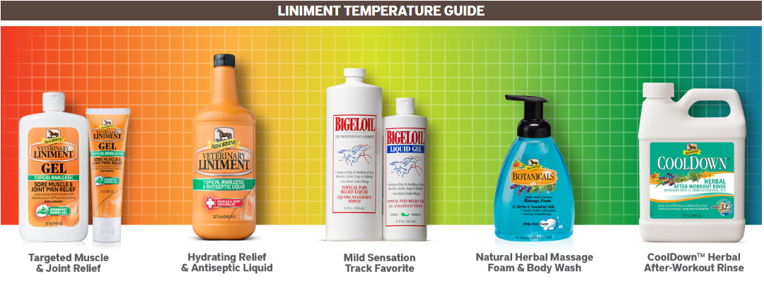 Uanset om hvilket niveau du rider på, så kan din hest have behov for at få løsnet stive muskler - eller måske bare et forfriskende bad efter en varm dag. Absorbine har udviklet en række linimeter, som hver især kan noget forskelligt; Gel Embrocation er ideelt til lokal behandling af skader og muskelspændinger; BigelOil Liniment er mildere end Liquid Embrocation og dermed god til sartere heste, dog med samme afspændende effekt; CoolDown er god som afkølende bad efter en hård og varm træning; mens Botanicals Massage Foam er nem at massere ind i musklerne ved en mere lokal behandling uden at det sviner.