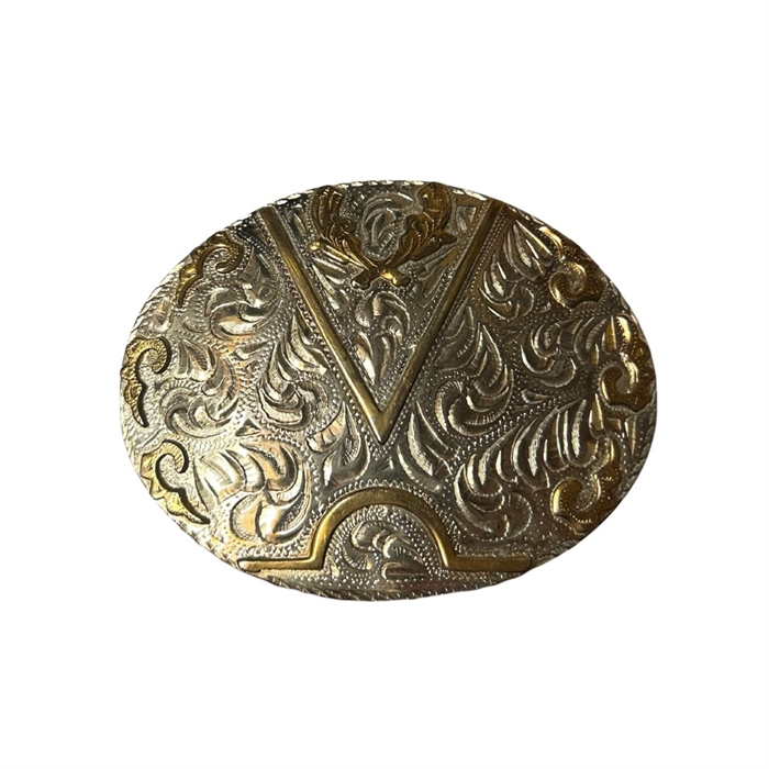 Ovalt bæltespænde fra Stars & Stripes i varm guldtonet finish med dyb blomster- og scrollgravering. Klassisk western-look til jeansbælter.