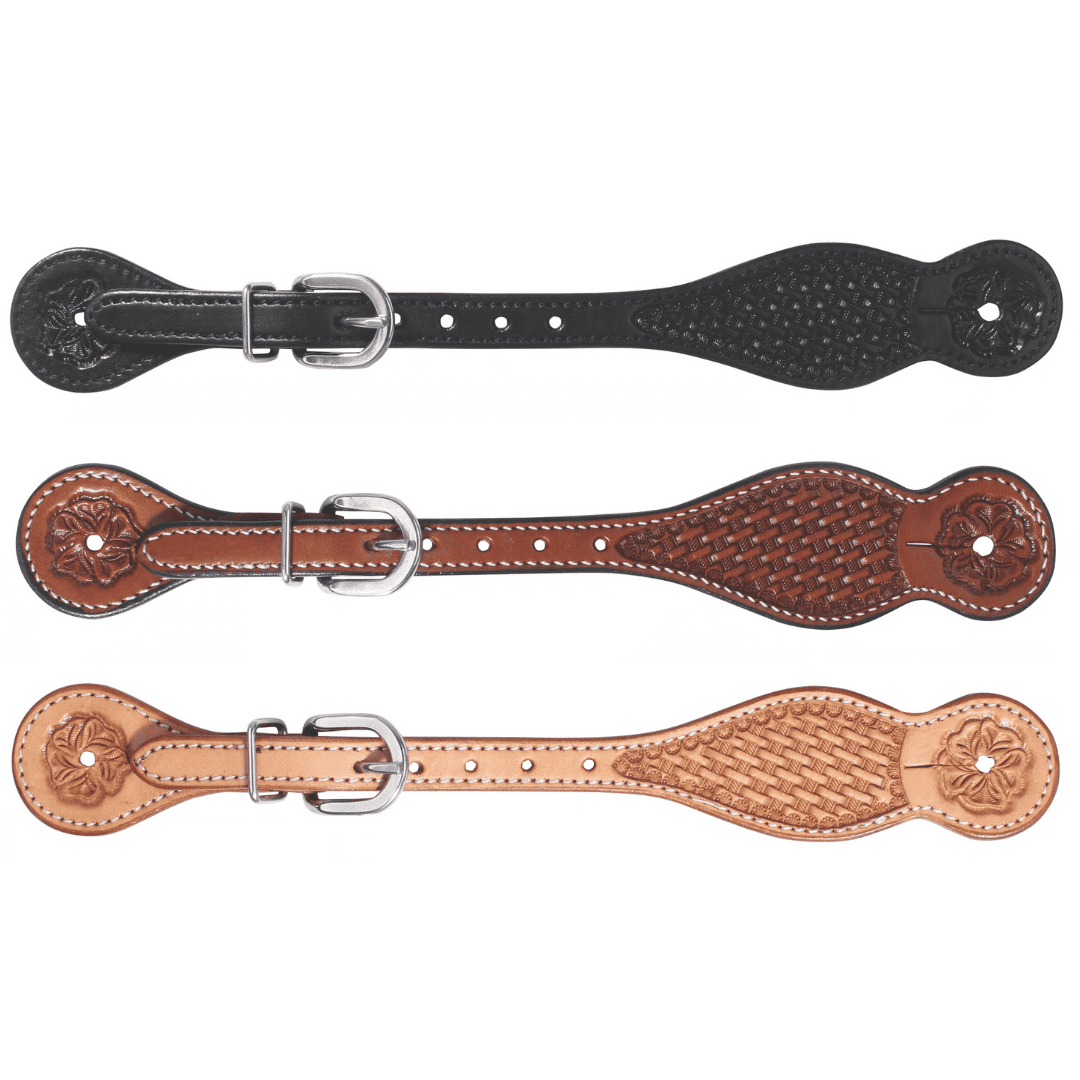 Prof. Choice Mesa Spur Strap til mænd med basket tooling og stainless steel 5/8” buckles. Klassiske western spur straps i Black, Chestnut eller Natural.
