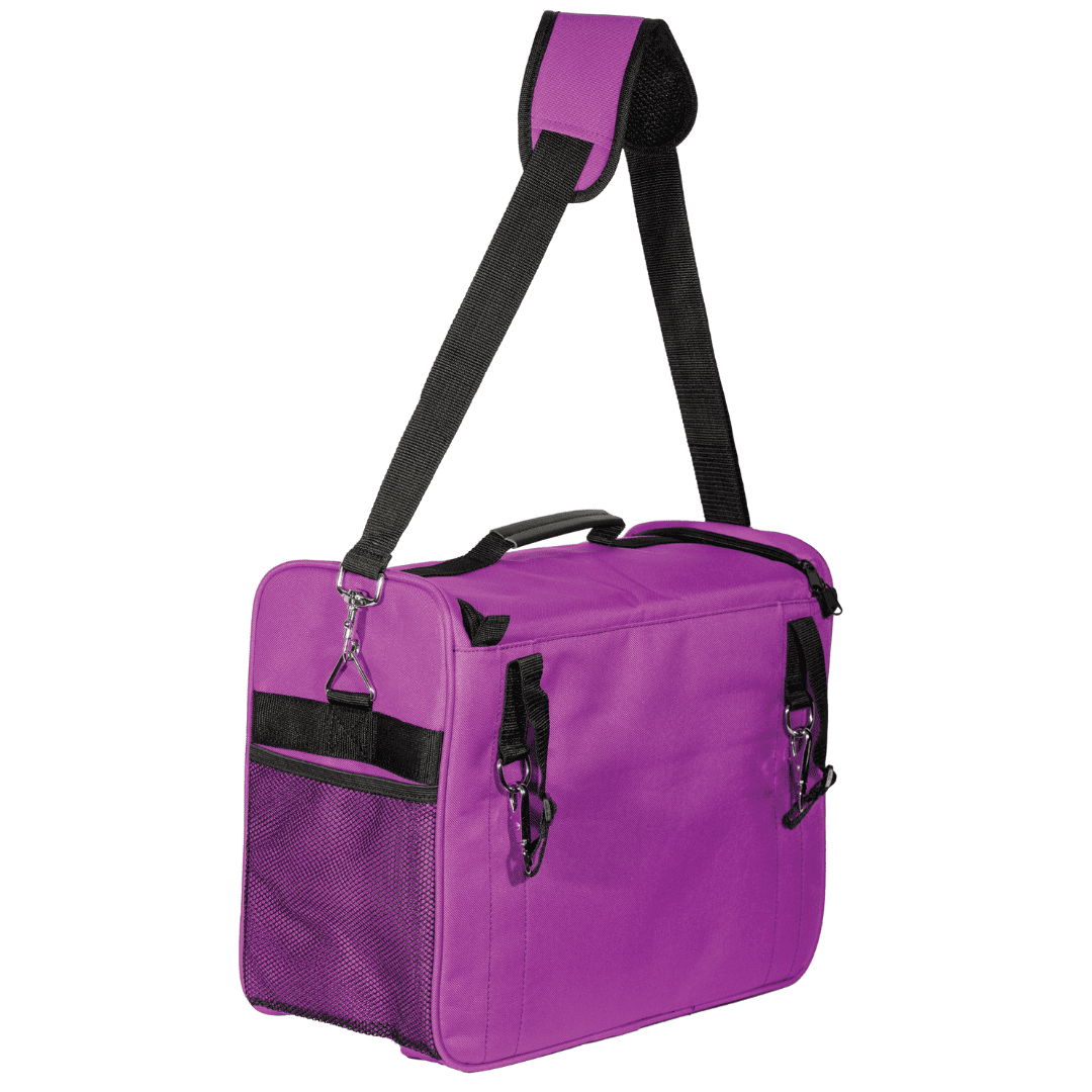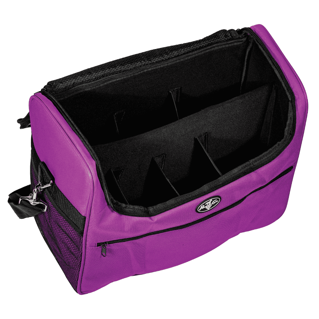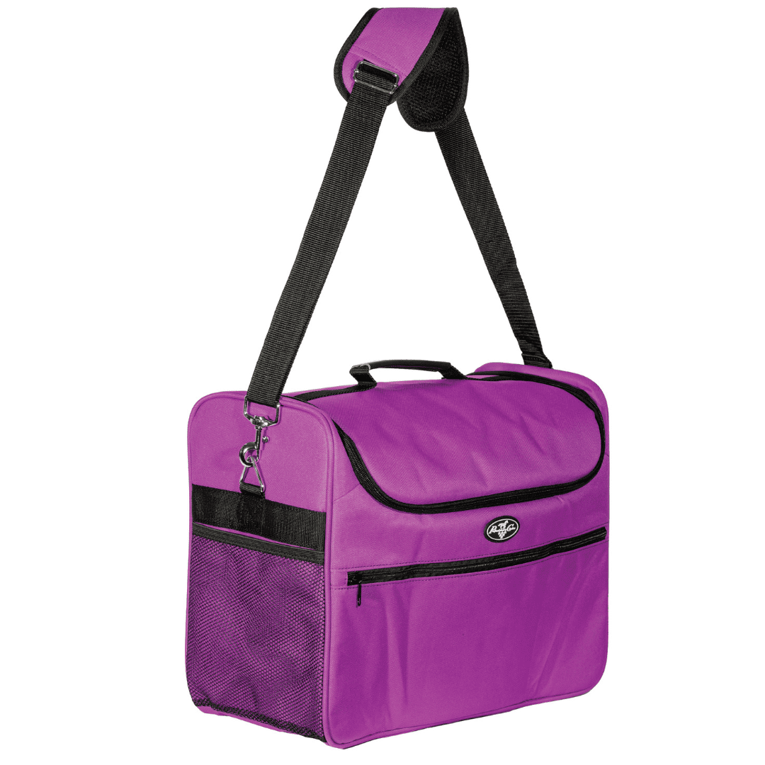 Praktisk og fleksibel organizer til stald og stævne med flytbare rum, mesh-lommer og polstret skulderrem til plejeudstyr og småting.