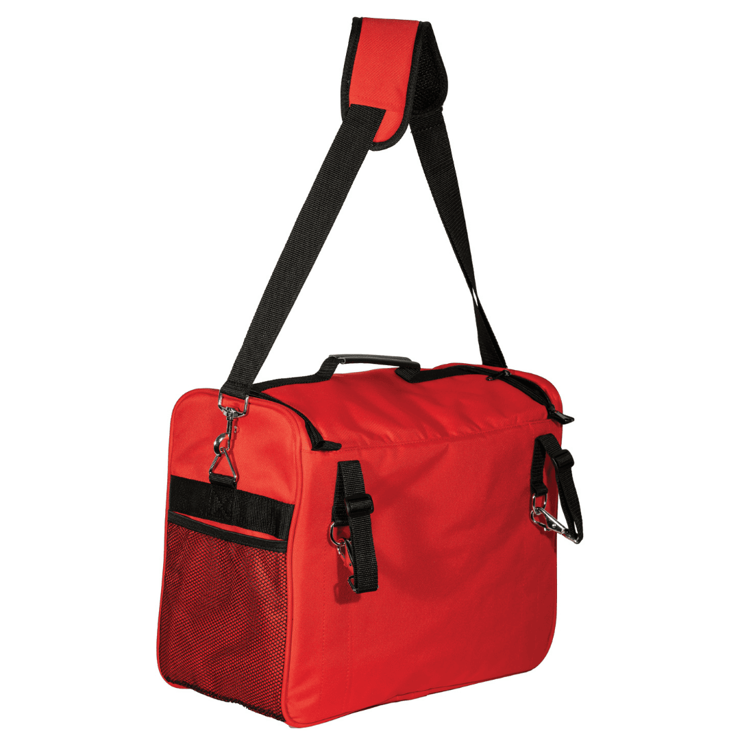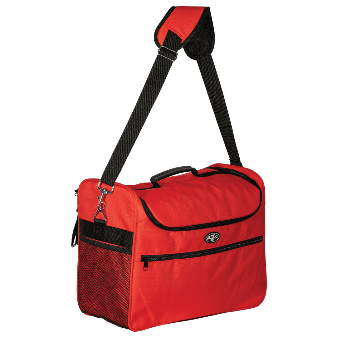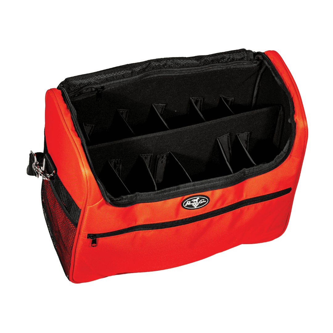 Praktisk og fleksibel organizer til stald og stævne med flytbare rum, mesh-lommer og polstret skulderrem til plejeudstyr og småting.