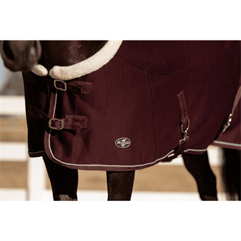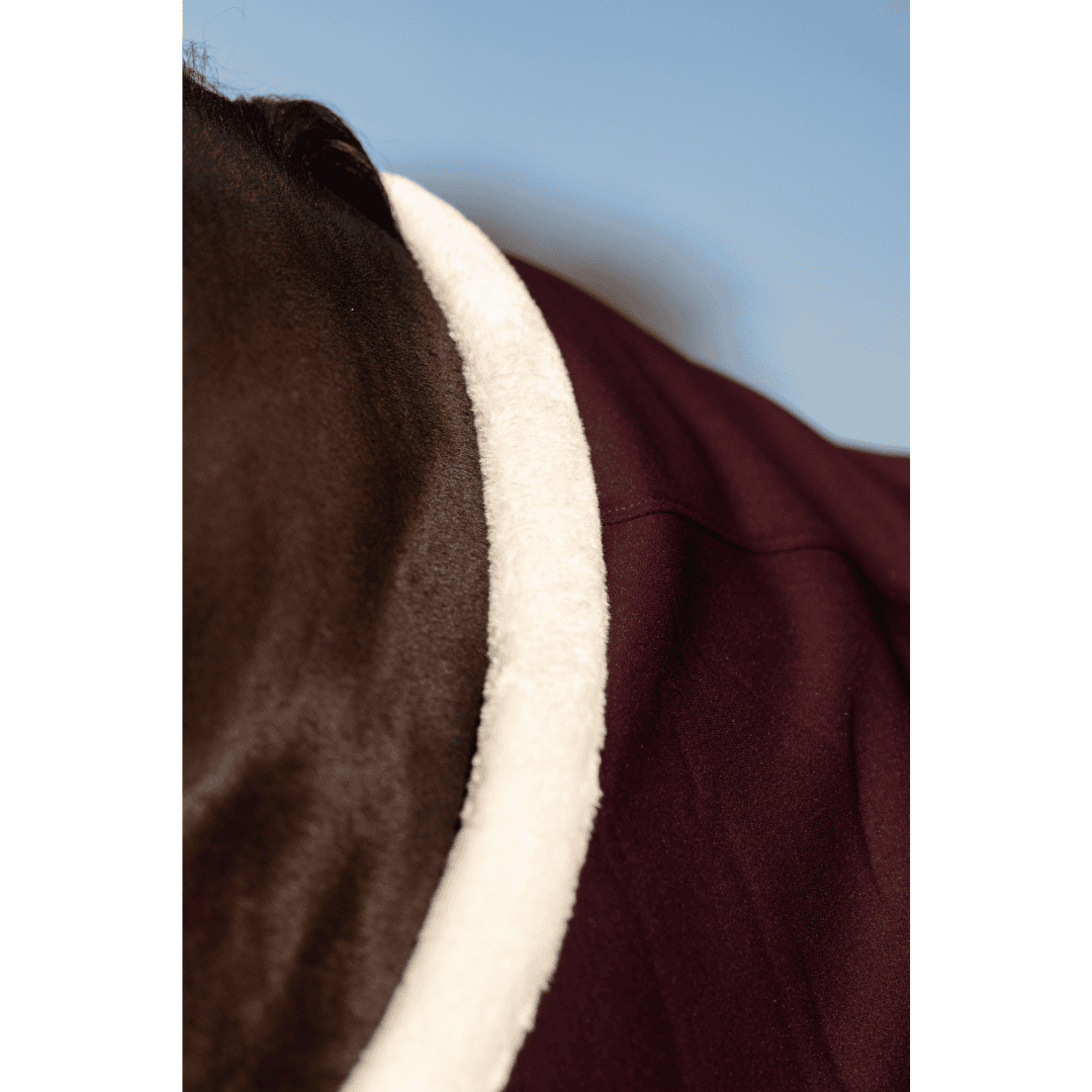 Fleeceforingen fortsætter omkring halskanten, hvilket hjælper med at reducere risikoen for gnidninger og irritation. Den bløde kant omkring halsen er en gennemtænkt detalje, som gør dækkenet særligt relevant til heste, der er følsomme omkring manke og halsområde. Kombinationen af varme, komfort og reduceret friktion gør dette dækken til et funktionelt valg for ryttere, der ønsker udstyr med fokus på hestens velvære.