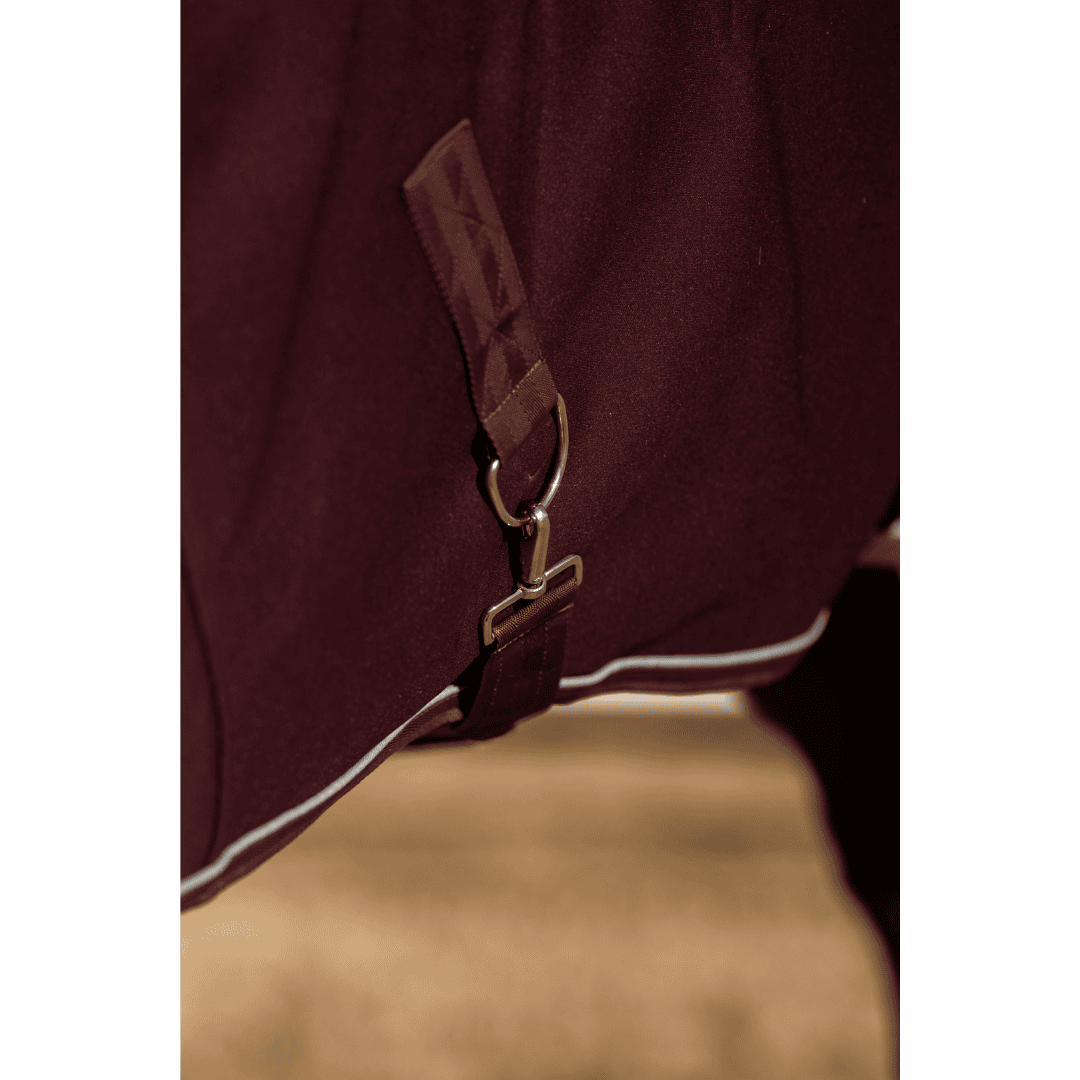 Mavestropperne er udformet i en criss-cross-konstruktion og er forsynet med snap- og ringlukning. Denne løsning bidrager til en sikker og stabil pasform, samtidig med at dækkenet er nemt at tage af og på. Frontlukningen kombinerer velcro-lukning med dobbelt spænde, hvilket giver mulighed for en mere justerbar og individuel tilpasning. Det gør det lettere at opnå en god pasform til den enkelte hest og understøtter både komfort og funktion i daglig brug.