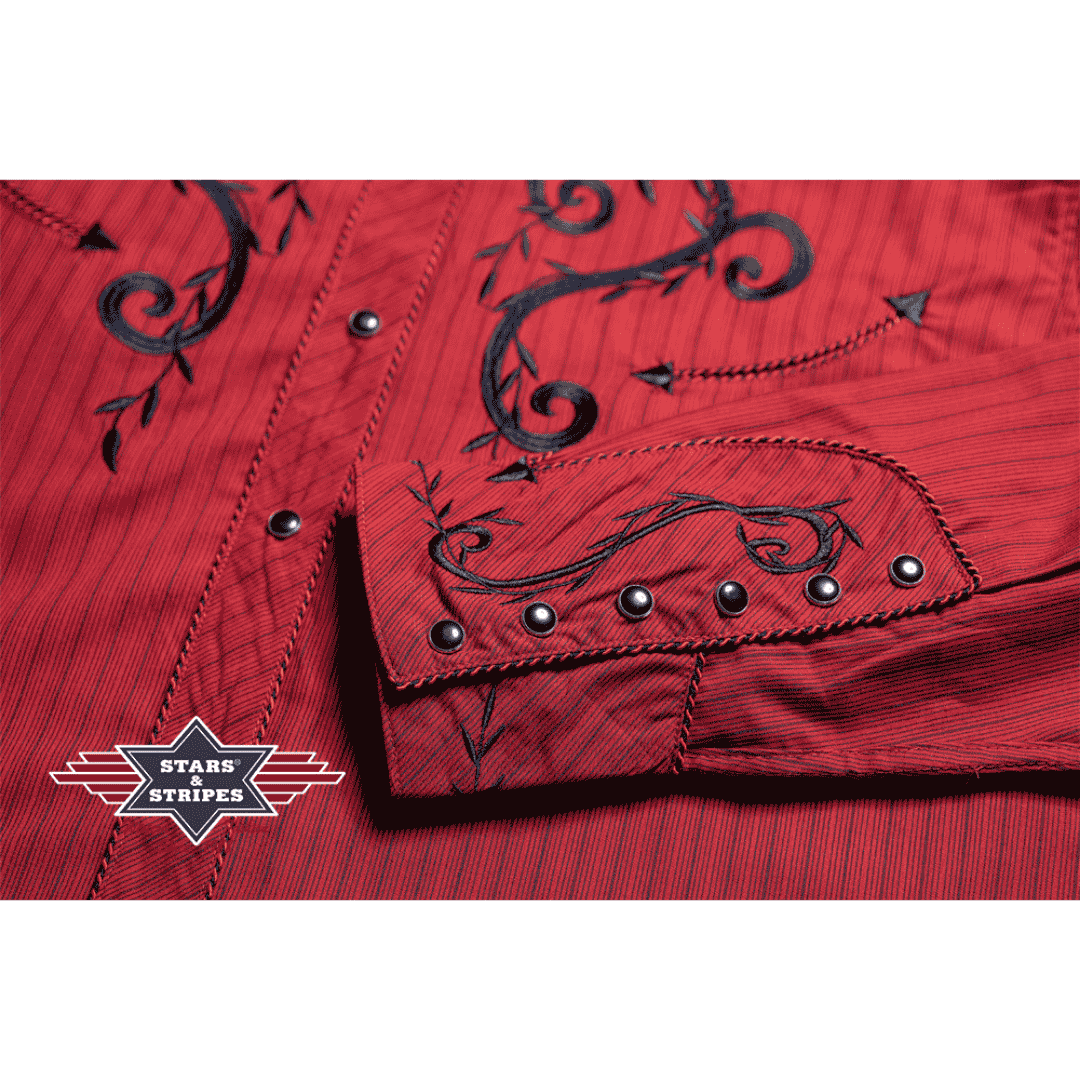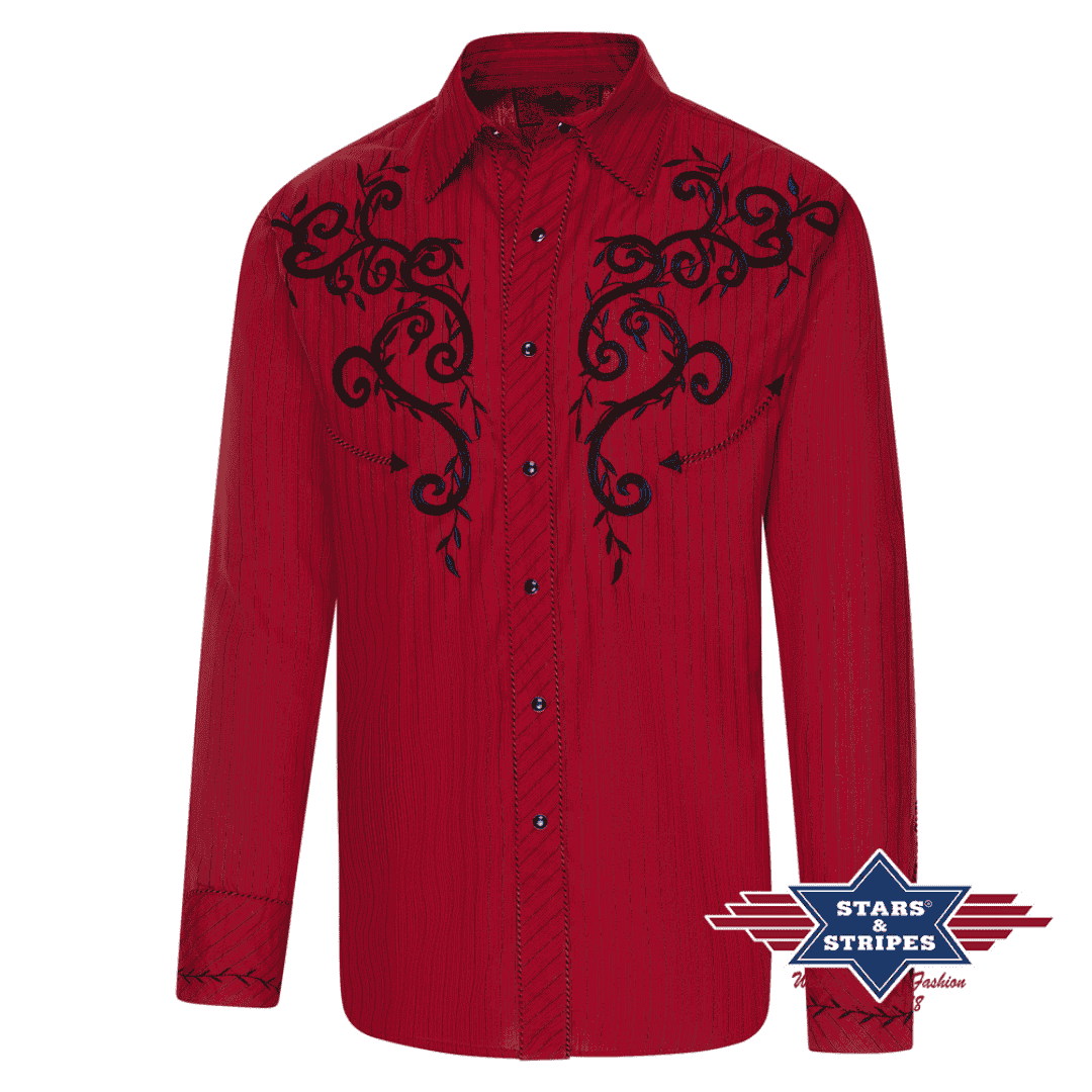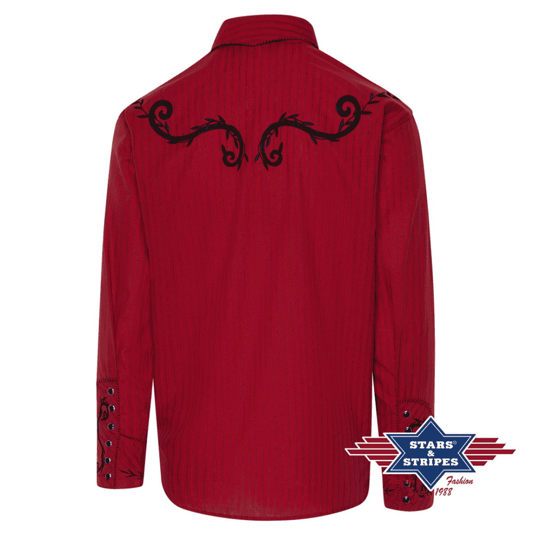 Eksklusiv rød westernskjorte med bryst‑ og rygbroderi, tofarvet piping, brystlommer og seksknaps manchetter. Let pleje, skræddersyet pasform.