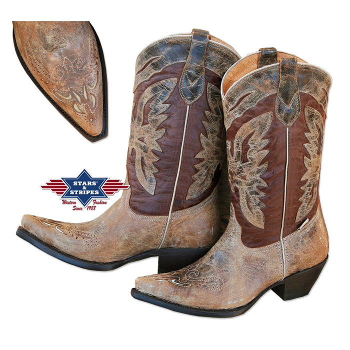 Stars & Stripes damestøvlen i farverne Crater MielOro Nacarado og Barcelona Carlos V forener håndværk, komfort og karakter. Overlæderet i 100% koskind er kunstfærdigt dekoreret med broderi og indlagte applikationer, som giver dybde og spil i nuancer fra honningbrun til perlemorsgylden.