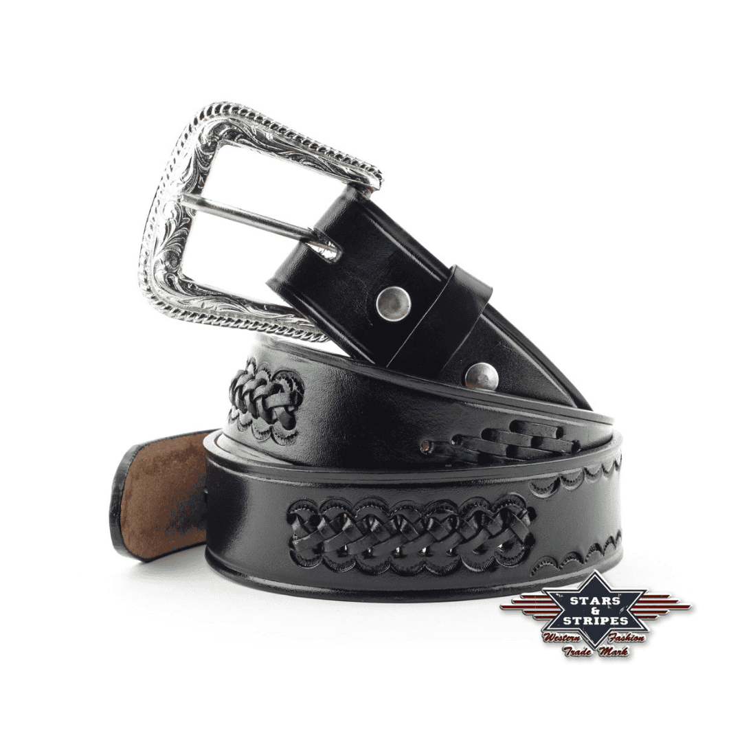 Sort westernbælte i robust læder med flettet prægning og udskifteligt, ornamenteret spænde. Perfekt til jeans og boots.