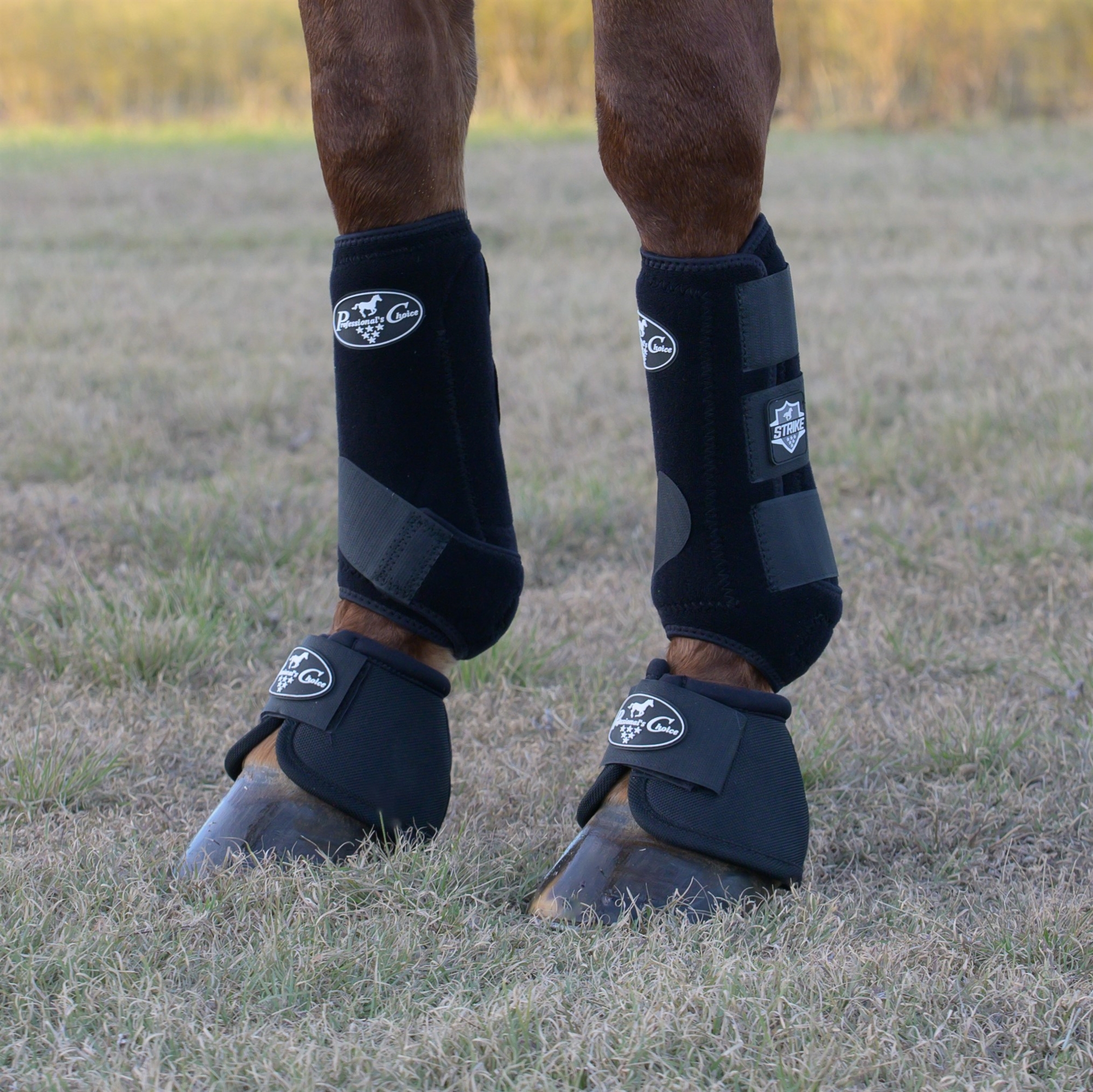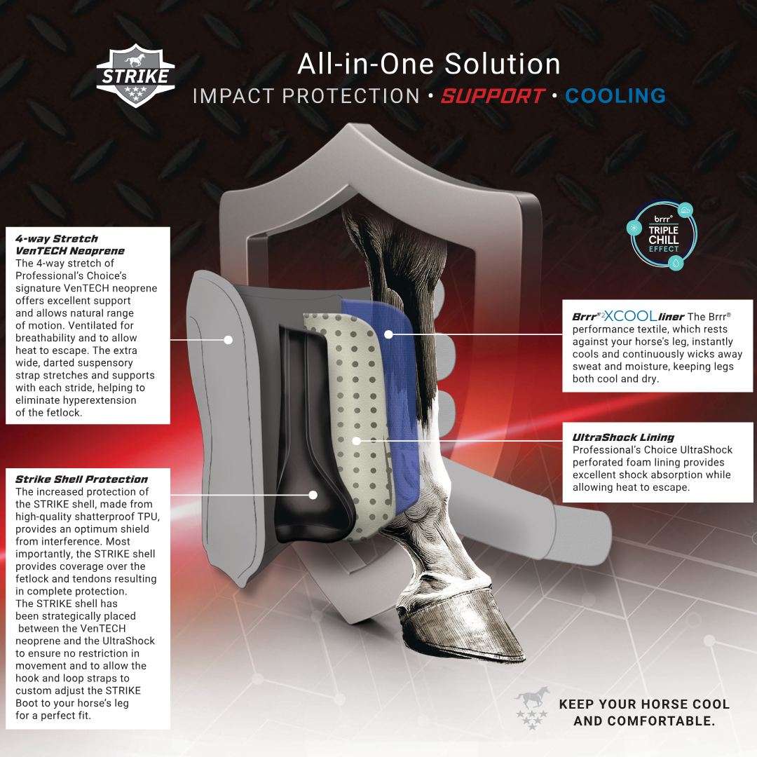 Den forbedrede beskyttelse af STRIKE-skallen, fremstillet af høj kvalitet, splintret TPU, giver en optimal barriere mod slag. Mest vigtigt er det, at STRIKE-skallen dækker kodeleddet og senerne og dermed giver fuldstændig beskyttelse. STRIKE-skallen er strategisk placeret mellem VenTECH-neoprenen og UltraShock-foringen for at sikre uhindret bevægelse og muliggøre, at velcroremmene kan tilpasses individuelt, så STRIKE-gamachen passer perfekt til din hests ben.
