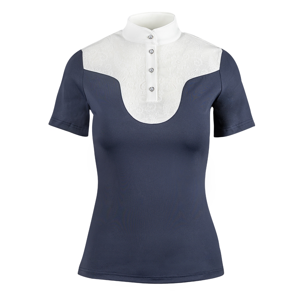 Materialet har firevejsstræk, hvilket sikrer enestående bevægelsesfrihed og åndbarhed, så rytteren forbliver frisk mellem klasserne. Elegante knapper i imiteret perle og en fin blondedetalje giver et raffineret udtryk, der smukt forener stil og funktionalitet. Den klassiske hvide udgave udstråler tidløs elegance og er perfekt til traditionalister, mens den marineblå variant giver et moderne touch for dem, der ønsker at skille sig ud.