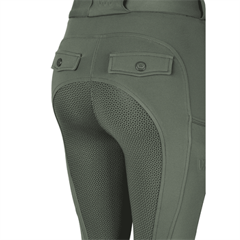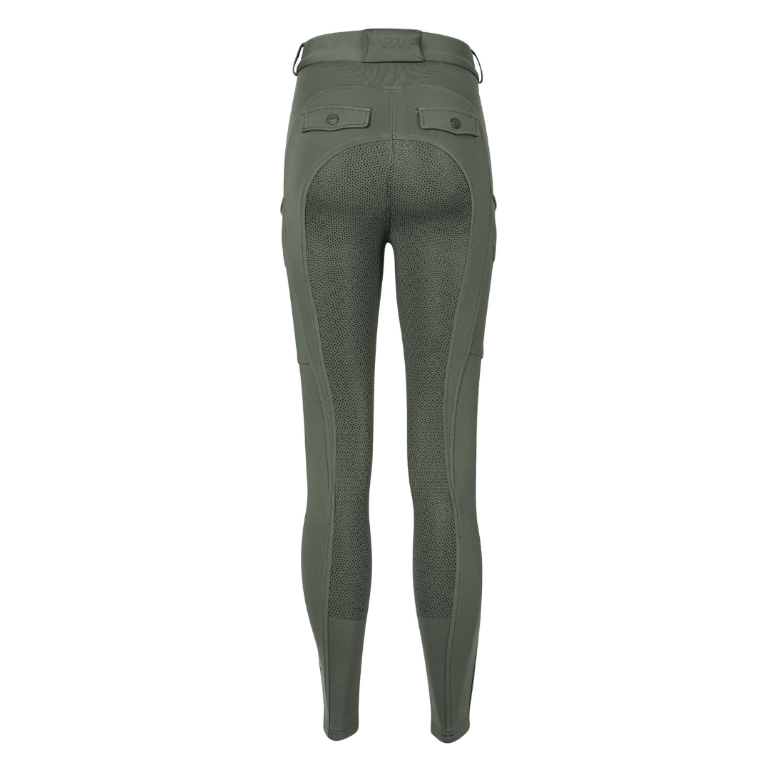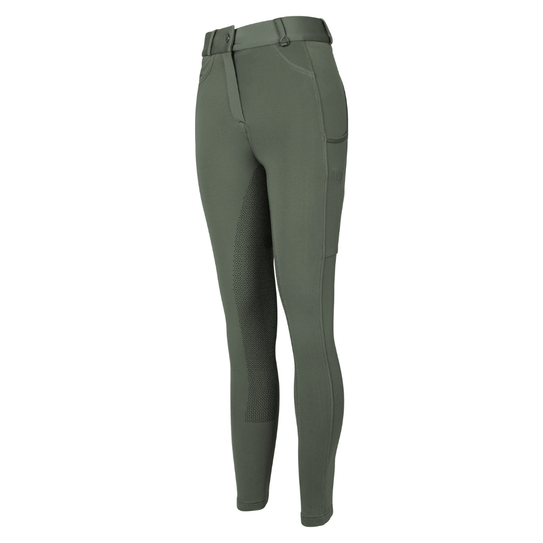 Hybrid ridebuks i Sage med breeches‑look og tights‑komfort: lynlåsgylp, bæltestropper, falske baglommer, høj talje og Micro‑Grip full seat. 4‑vejs stræk.
