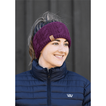 Kabelstrikket Woof Wear pandebånd med blød, isolerende fleeceforing og diskret faux‑læder WW‑badge. Varmt, let og stilrent i Stone, Navy og Plum.