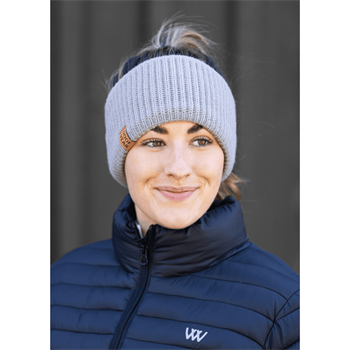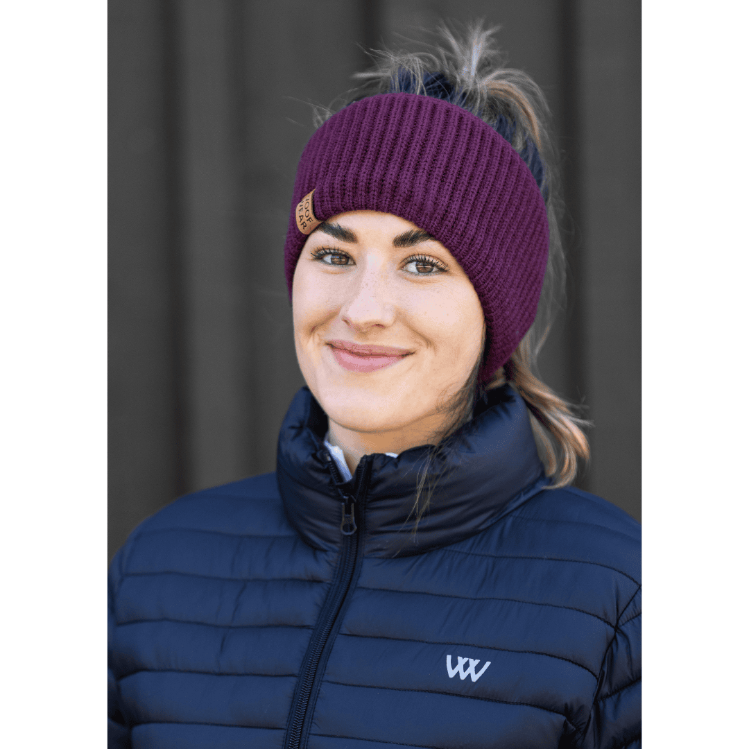 Woof Wear pandebånd med blød fleeceforing og faux‑læder WW‑badge. Holder ører og pande varme. Fåes i farverne Stone, Navy og Plum.